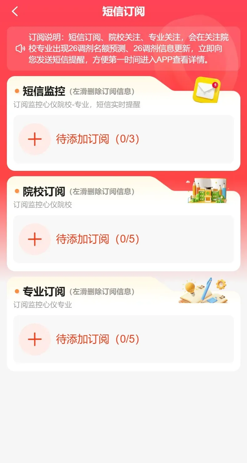 短信订阅:开启短信监控,一旦你订阅的院校发布调剂信息,系统针对性的推送短信提醒。