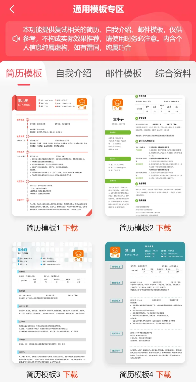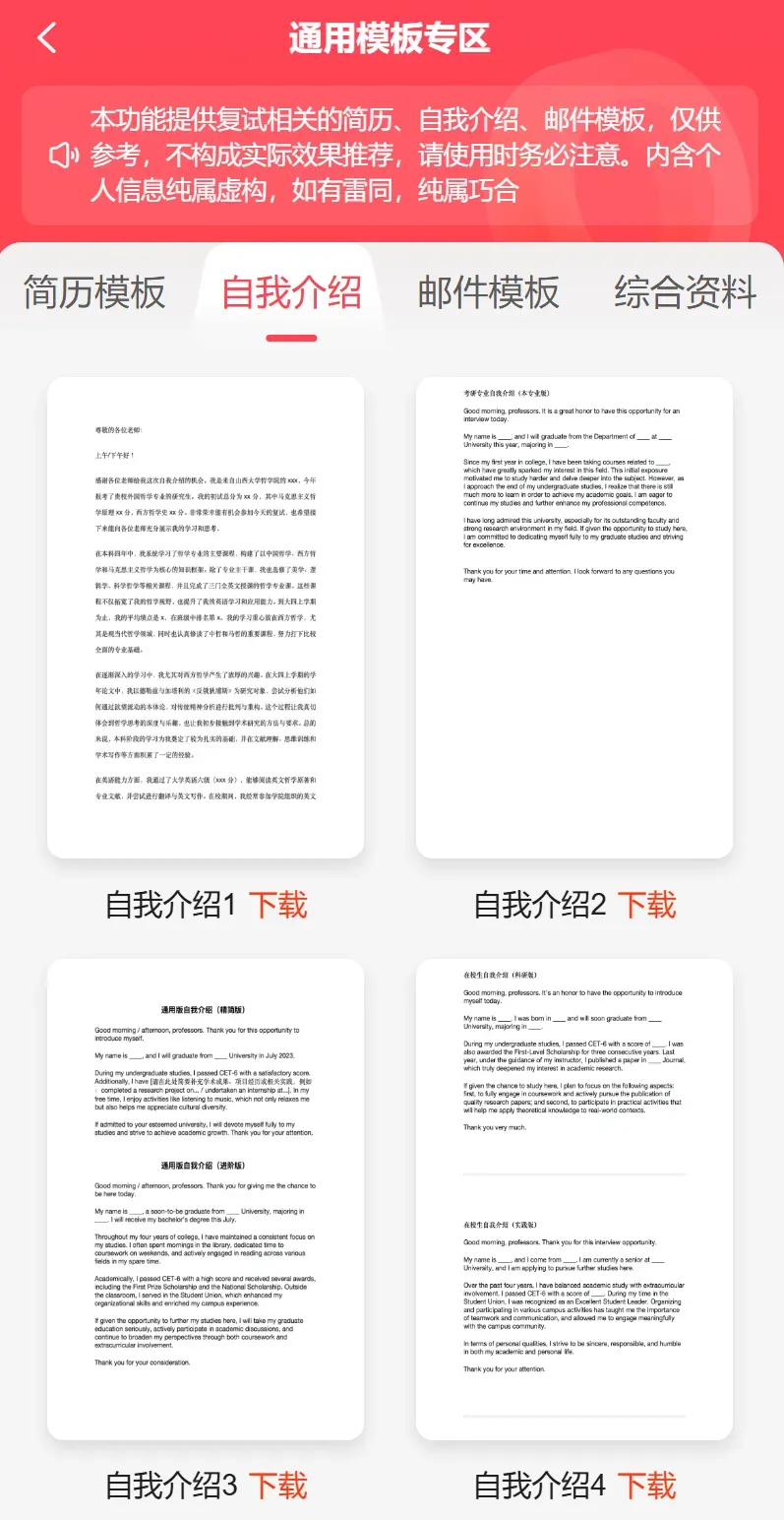 文书全家桶:包含精选简历模板、自我介绍模板,以及发给导师的中英文邮件模板。