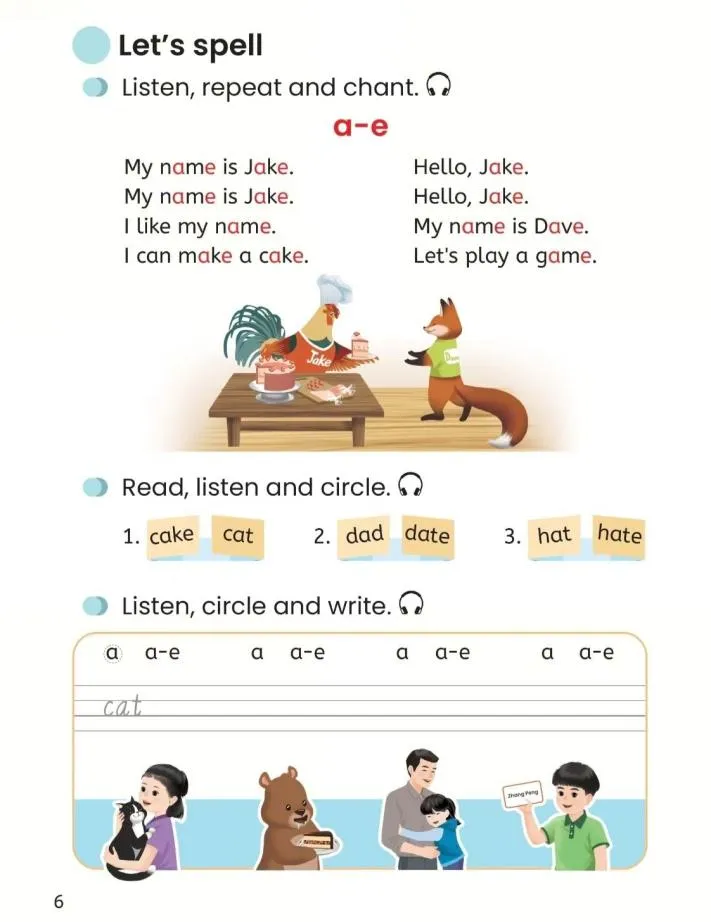 Show cake, egg pictures. Teach cake, egg (egg已学,强化认读).