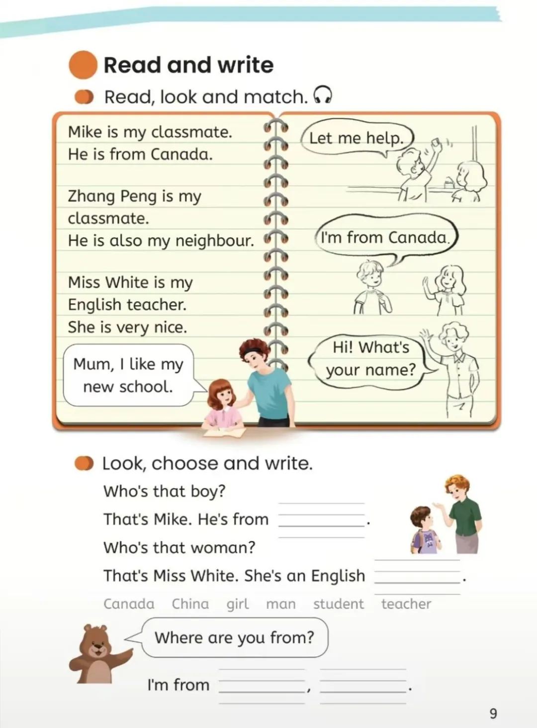 1. Show the picture of Mike and his mum. T: Look! It's morning. Mike is at home. What can you see?