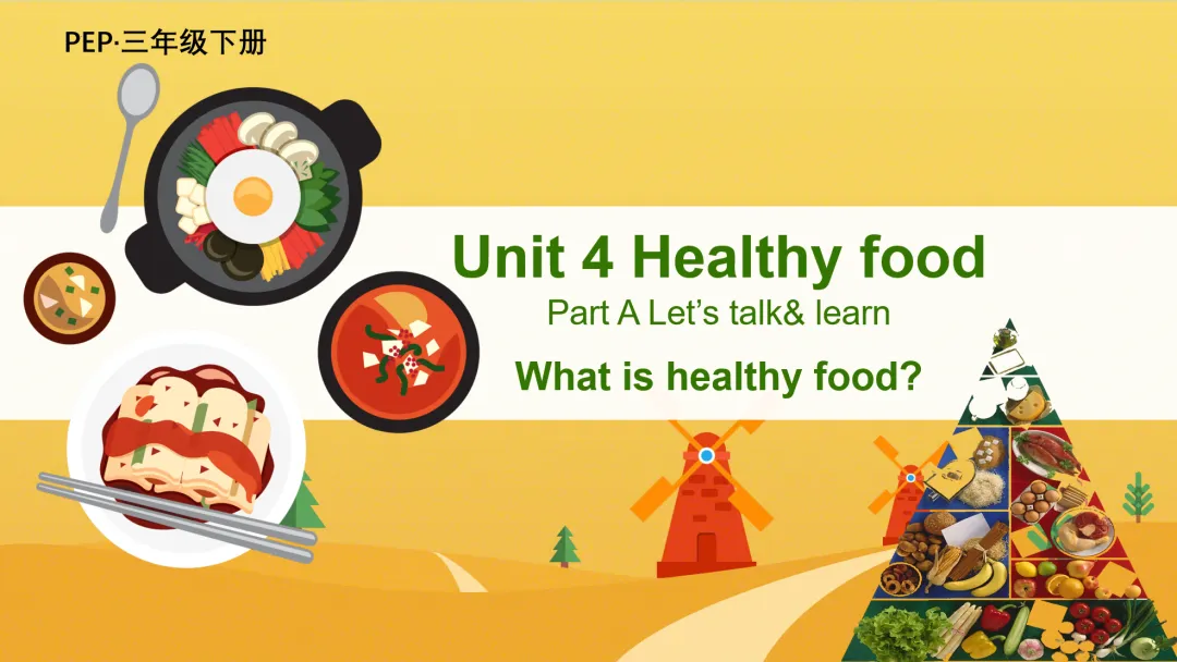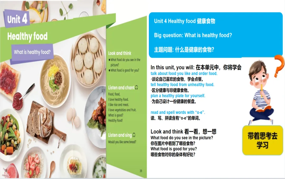 (设计意图:通过歌曲激活学生关于食物的已有词汇,营造轻松课堂氛围,自然导入本课话题。)