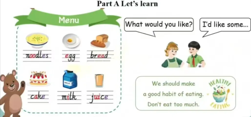 1. Greet students. Sing the song “What would you like?” together.