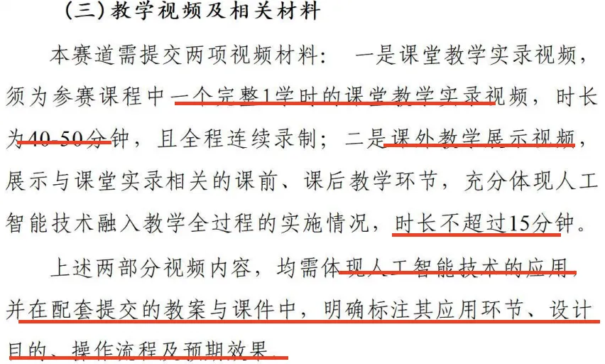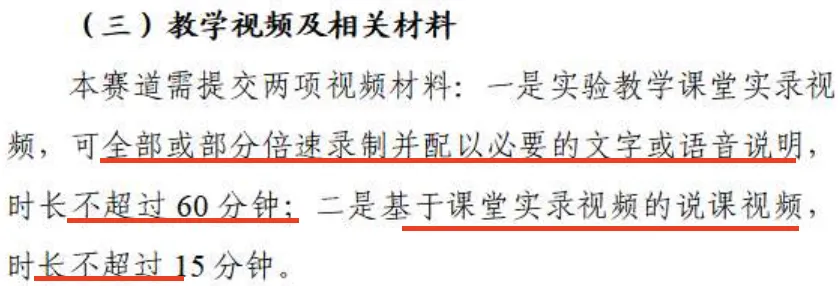 2021年我参加首届教创赛用的两个实录视频是2018年就录好的,是建设一流课程时录的,不是针对这个比赛。当时有专家建议我重录,因为发现里边细节问题很多,如PPT有些地方不清楚,有些地方摄像人员在镜头里随意走动等等。刚开始我有些纠结,后来经过自己反复观看,决定不再重录。为什么?因为两节课基本上都是沉浸式的课堂,且能代表我日常教学的常态。我知道一些参赛的老师,是因为细节而重录课程。其实,必要性不大,因为那些细节评委可能根本注意不到,即使注意到了,可能会对你实录的真实性会更加确信,有可能加分。课堂实录的真正用力点在于,仔细审视自己的课堂是否真的做到了沉浸式。所以,我在指导老师时会想方设法、绞尽脑汁帮助老师设计好实录的关键环节,最重要的目的是引导学生真正参与,进而真正打动评委。其他所谓的细节,如是否要进度条、是否有板书等,在我看来,可能没那么重要。有些参赛老师将一个主题90分钟,分成上下两节,似乎也可。但最好是两个不同的主题,每个主题是完整的1学时(通常45分钟左右),这样更便于沉浸。注意:第六届大赛新增人工智能和实验赛道,这两个赛道对教学实录做了特殊的规定(见下面截图),但其中的一节教学实录,不管是45分钟,还是60分钟,也需沉浸式才能真正打动评委。为什么学生会沉浸?有什么沉浸的好方法?