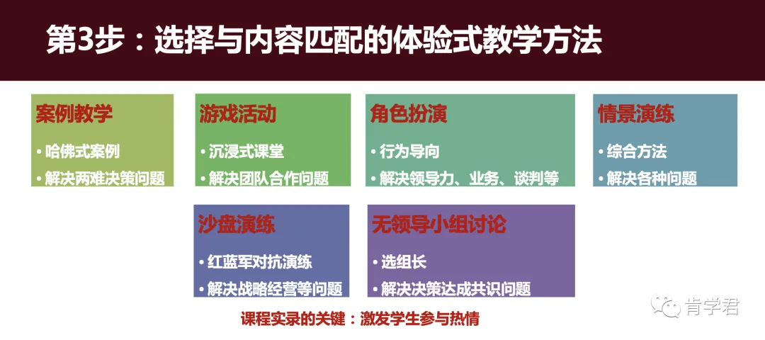 1.身临其境的感觉:沉浸式教学可采用虚拟现实、增强现实和交互式媒体等技术,让学生身临其境地感受所学知识。例如,在学习历史课程时,学生可以通过沉浸在历史场景中,体验历史事件,加深对历史知识的理解。2.情感体验的强烈性:情感体验是沉浸式学习中的重点,其目的是激活学生的情感体验,吸引他们注意力并使其全神贯注。例如,在学习语言课程时,通过扮演角色,学生会对语言表达产生个人感受并加深对语言知识的理解。3.认知体验的深度:沉浸式教学使学生能够在真实环境或虚拟环境中主动探索、发现和解决问题,同时学习过程具有强烈的学习体验和认知深度。例如,学生可以通过实验现象和模拟过程来了解和深入研究所学知识。沉浸式教学方法很多,如案例教学、游戏活动、角色扮演、情景演练、沙盘演练、无领导小组讨论等,关键是激发学生参与热情,如下图。常用的沉浸式教学方法包括:情境设计法、个性化学习法、视听教学法和全程参与法等。