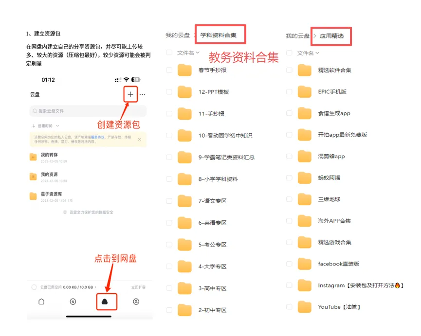 打开迅雷网盘,点击“云盘”这里,再点击右上角“+”号,创建资源包。你想推广什么资源,就创建什么资源文件夹(比如游戏、教辅资料、软件、短剧、小说、旅游攻略等)。