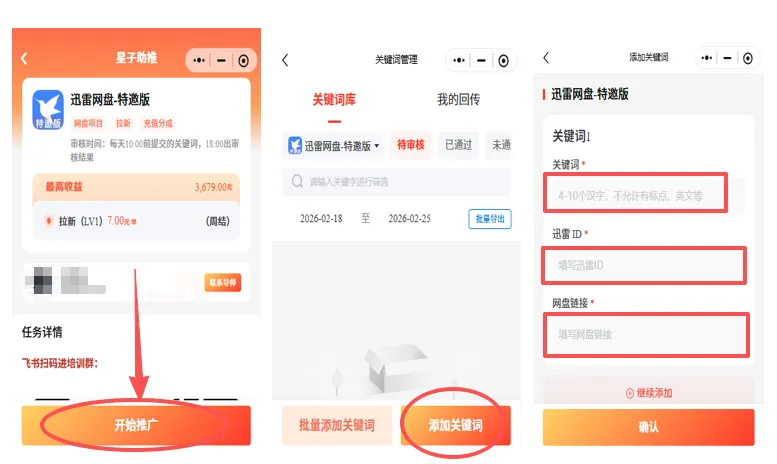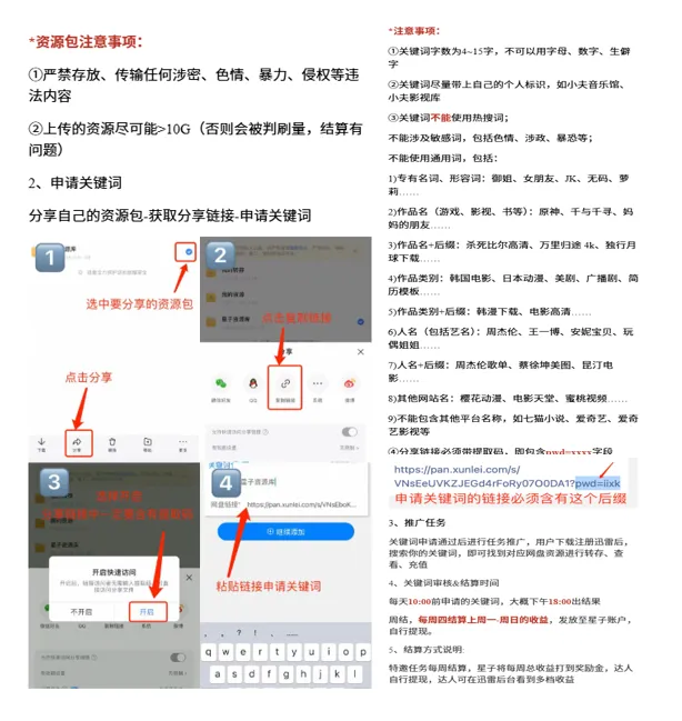 分享自己的资源包-获取分享链接-申请关键词。多数新人都会卡在这一步,不知道怎么操作。在“星子助推”首页,打开“网盘”—“迅雷网盘-特邀版”,点击最下面的“开始推广”-“添加关键词”,进入到添加关键词页面。