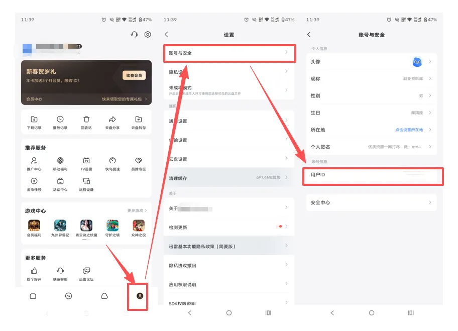 迅雷ID:你进到迅雷网盘,点击“我的”,右上解“设置”-“账号与安全”,这里就可以看到用户ID号,复制过来,或是直接填写进去。