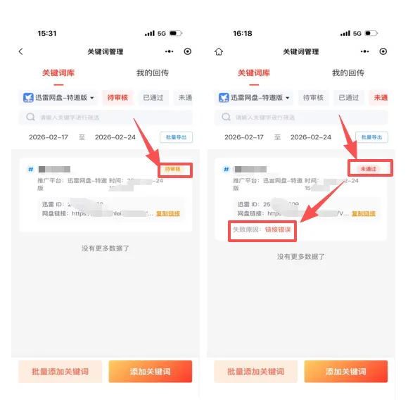 像伙伴申请的这个,未通过,提示链接错误,这种情况只需要修改网盘链接,重新去复制正确的网盘链接,再提交即可。如果提示关键词不可用,那就换关键词,再提交审核,直到通过后才能使用。