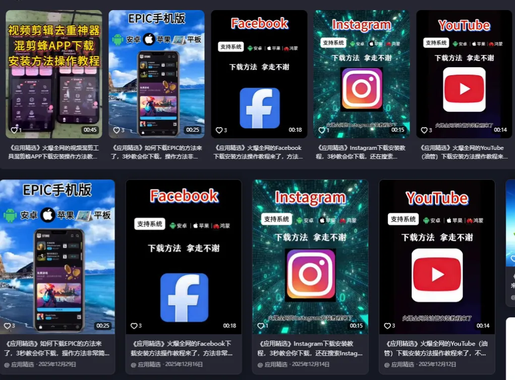 不知道怎么操作,可以去抖音上搜索同行的视频参考。搜索“应用精选”、“软件下载”、“3秒教你下载”、“10秒教你下载”、“游戏下载”等,看看别人怎么做的视频,跟着去做,先找灵感。