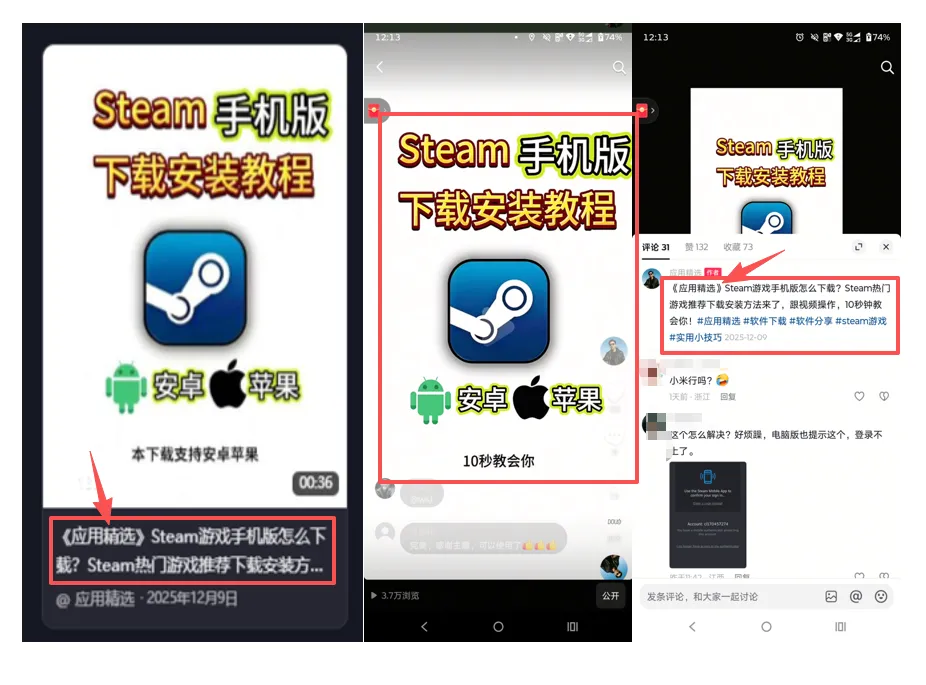 比如像这个“Steam 手机版下载安装教程”,从封面,到文案,到内容,都要有关键词,这样更给吸引人。这里标题做了关键词布局,新手不会可以只使用关键词就行。假如你一个月能做这种爆款视频100条左右,稳定收益就是大几万。