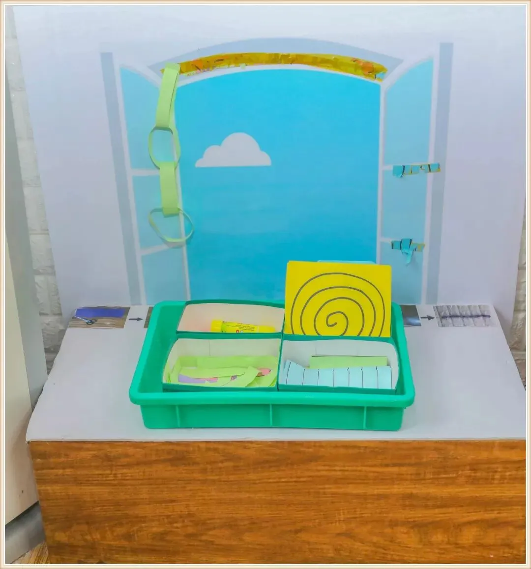 主要材料:窗户背景图、不同线条的剪纸图案;操作卡“妈妈的新发型”,辅助材料:毛球、吸管、扭扭棒、彩色纸、亮光纸、胶棒、双面胶、剪刀等;折纸示意图“我爱我家”“送给妈妈的小包包”。
