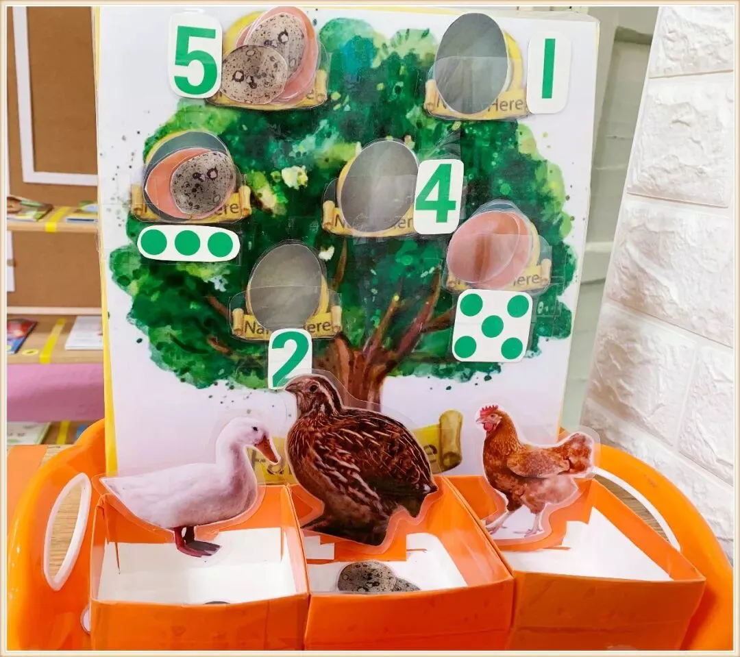 主要材料:饲养区投放常见的乌龟、泥鳅、蝌蚪、金鱼;欣赏区种植春季花卉、多肉类、水培类植物;认知区:鸡蛋、鸭蛋、鹅蛋、鹌鹑蛋,鸡妈妈、鸭妈妈、鹅妈妈、鹌鹑妈妈图片;工具区投放铁锹、喷壶、剪刀。