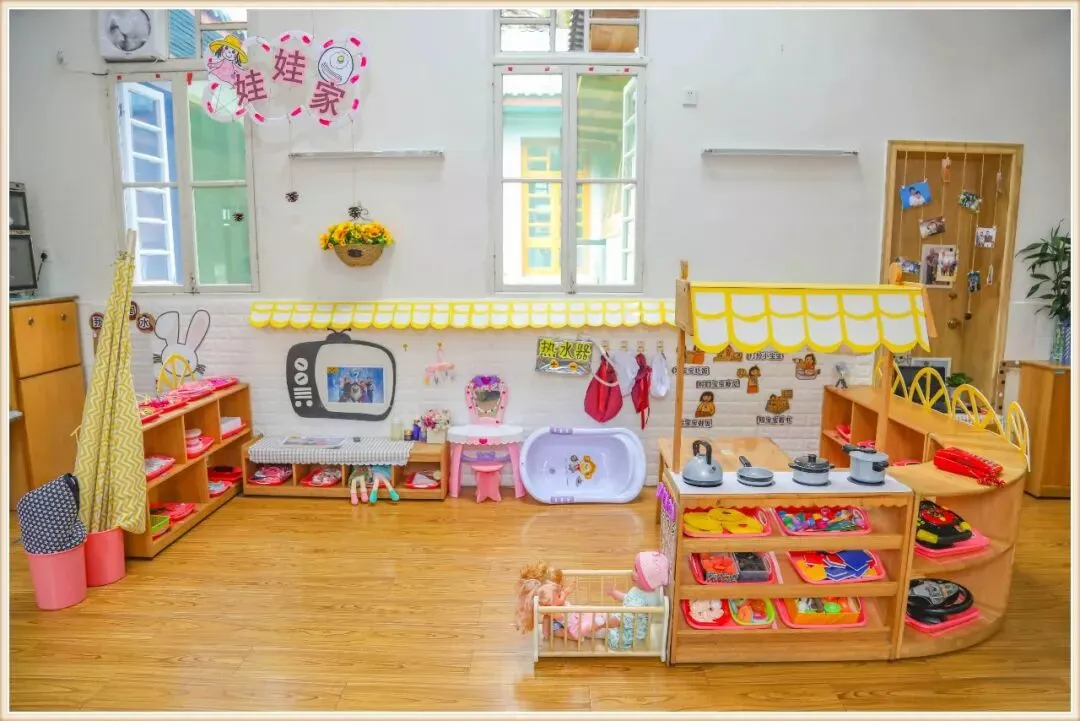 创设娃娃家,重点布置娃娃厨房和卧室两个区,采用半开放半固定区域的形式开展,娃娃家与生活区有机融合,投放电视机、家具、热水器、餐具、食物、小床、装扮类物品供幼儿创造性的开展角色游戏,提供帐篷、椅子等,供幼儿进行开放性游戏。