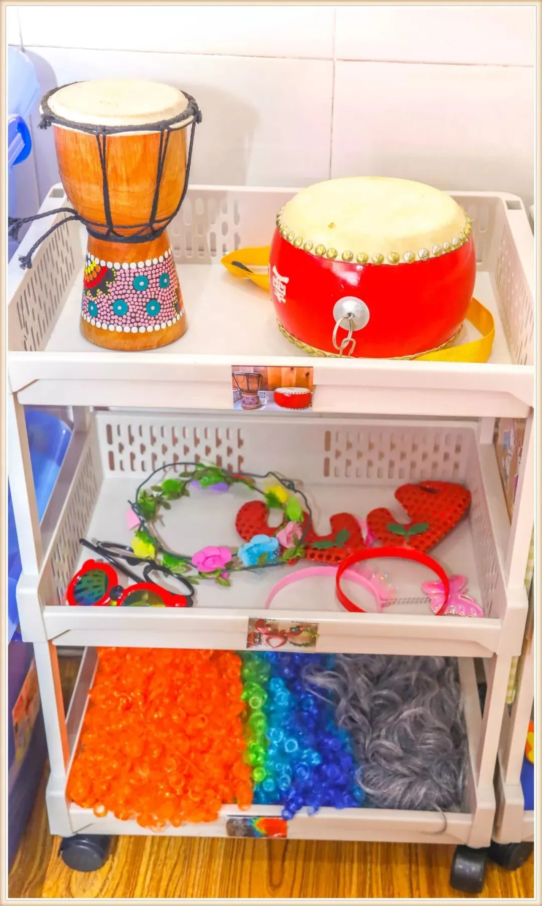 艺术表演区需要相对独立的空间,避免与其他区域相互干扰。该区域为开放性区域,表演区材料放置在寝室,用可移动置物架摆放。投放与本主题相关的教学CD、幼儿熟悉的打击乐器、话筒、服装、头饰等材料,供幼儿进行艺术表演,活动时幼儿可根据意愿选择将区域创设在走廊或寝室。