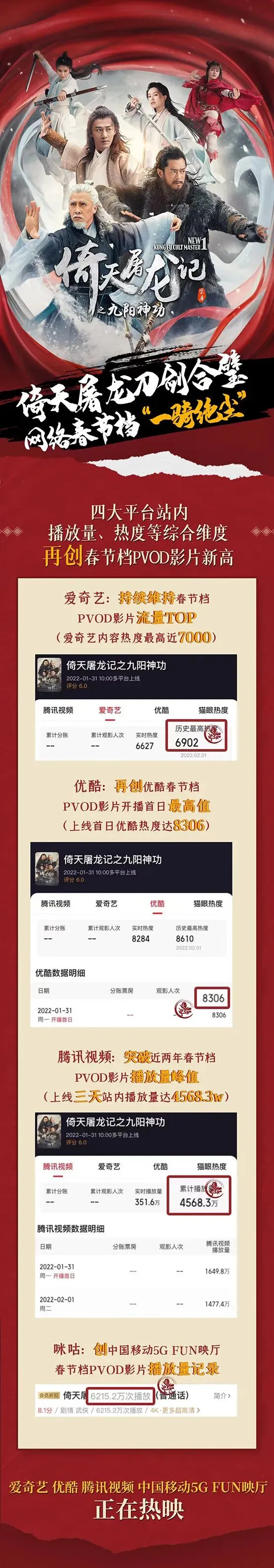 “这是属于2022的武侠新片,谢谢爱电影的他们让江湖永在。”当下,院线春节档激战正酣,群雄竞逐。线上端,由王晶导演的2022新版《倚天屠龙记》系列(《倚天屠龙记之九阳神功》《倚天屠龙记之圣火雄风》)正以一骑绝尘的热度和势能领跑网络春节档,也给2022年电影春节档增添了别样的时光滤镜和电影情怀。近年,全球电影发行模式发生深刻变革,线上发行市场已成为不可忽视的新选择。而首次尝试爱奇艺、优酷、腾讯视频、咪咕四大平台网络首播的《倚天屠龙记》不负期待,上映三日维持爱奇艺春节档PVOD影片流量TOP1,再创优酷春节档PVOD影片开播首日最高热度值,腾讯视频上线三天站内播放量近5000w突破平台近两年春节档PVOD影片播放峰值,创中国移动5g FUN映厅春节档播映影片播放新纪录,上映4天播放破亿,热度爆棚。作为网络视频平台第二年网络春节档的内容升级,《倚天屠龙记》系列在全平台爆发,2022春节档,《倚天屠龙记》必须有“姓名”。而春节档线下+线上多样化的主题和内容,不仅丰富了春节期间优质网络视听节目供给,也更好地满足了观众日益多元的影视文化需求。春节档需要《倚天屠龙记》。2021年春节,由国家广播电视总局网络视听节目管理司指导,中国电影家协会网络电影工作委员会联合爱奇艺、腾讯视频、优酷三大平台联手推出首个线上的网络春节档。去年大年初一,三大平台选择用联播的方式推出《发财日记》这样的强IP、强类型、高国民度明星主演的电影,以PVOD单片付费模式播出,取得了观众、片方和平台的多方共赢。事实上,线下春节档十年,渐渐衍变成一个“集大成”的红海市场,在线下市场有限的排片份额中,单日要为七八部大片挤出生存空间,势必造成某些优质影片未能充分“发酵”,全面接触到观众和市场。技术在变,观众在变。顺应时机,应时而变。为每部电影选择合适的发行渠道和方式,不失为明智之举。线上单片付费模式被认为是未来电影发行的新趋势,并有望反哺到内容创作中,与线下院线电影形成合力,做大做强电影市场,推动电影产业的良性发展。而2022版《倚天屠龙记》这种“多平台播出+单片付费+春节档”的商业模式创新,将发行渠道变成了网络平台线上播映,不得不说是一次顺应时势,另辟蹊径的创新发行选择。其次,从经典IP《倚天屠龙记》本身来说,也更具备得天独厚的网播优势。有金庸先生的著作基底在前,《倚天屠龙记》因此成为统一全民几代人审美和情感的故事。王晶导演1993年改编自金庸先生原著的《倚天屠龙记之魔教教主》可堪影史武侠经典,诸多名场面至今仍在中文语境和互联网场域流传甚广,奈何《倚天屠龙记之魔教教主》只有上集没有下集,近30年过去了,观众还是未能如期看到张赵二人相会,“大都对决”成为几十年的意难平。这份缺憾勾着观众,29年后赴大都之约,2022新版《倚天屠龙记》无疑适合春节期间全家人一起找回情感共鸣和情怀回忆。而《倚天屠龙记》式的武侠电影也是特属于中国的类型片,不仅有江湖奇侠张无忌学武练神功的曲折经历,还有江湖儿女的情感纠葛,内容精彩饱满。此次2022新版《倚天屠龙记》集结老中青三代实力演员倾情演绎,又有东方奇幻式的正统真武侠,两代恩仇二十九载之会再赴约,特别适合网络观看。尤其在武侠剧匮乏的影视市场,影片为线下市场做了有力的补充和丰富,也势必会在网络春节档中引领新的潮流。再次,香港影人及制作团队日益成为近年中国电影市场的中坚力量,他们资历老、经验足、有商业类型片的自觉。在院线市场中,王晶导演更具备充分的商业敏感和市场觉悟,如今将这样一部全民共情的经典续作引入线上春节档,可堪识时务的创新之举和因地制宜的新模式先行者。张无忌去大都和赵敏再续前缘,2022新版《倚天屠龙记》作为承载了二十九载满满情怀的续作,无疑带着品质升级和创新的“使命”而来。制作的升级伴随着内容的当下性和精品化。重启《倚天屠龙记》系列,新版在价值观上与现代年轻观众更贴合,也对原版的粗糙特效和故事进行了补充和圆满。故事上很大的亮点是张无忌跟三个江湖女儿赵敏、周芷若、小昭的情感纠葛更具备当下看点和现实意义。情感纠葛有“糖”有“醋”,是双强的事业伙伴型还是隐忍付出型,都亟待观众从正片中解读。其次,新版《倚天屠龙记》也加入了过往版本中甚少表现的波斯三使圣火令武功,此圣火令武功在影片两次大决战中发挥了重要作用。以及还有看似“深藏不漏”的成昆其大阴谋的施展。故事之外,影片在叙事节奏、特效、演员搭配、武打设计、美术等方面都有很大进阶。新版《倚天屠龙记》用大银幕质感的制作与视听,用一个新的包装,让武侠世界恰逢其时地重现。在极不多见的武侠片市场里,新版《倚天屠龙记》把几十集的剧情浓度浓缩成几小时电影,时间跨度大却叙事紧凑,剧情张弛有度,衔接恰当,在叙事节奏和效率上付出了相当的用心。而在“六大派围攻光明顶”的重头戏中,充分阐释了太极拳的核心奥义重意不重形。剑气远攻,重在写意,酣畅淋漓的打戏,动作精彩,富于创意。观众能够看到顶级特效与顶级想象力丰富的打戏,又帅又飒的武打氛围,折射出的是正义凛然的侠义精神。除了武术方面的大手笔,人物造型和服化道也是可圈可点,高质量港式幕后团队的加持,为影片质量