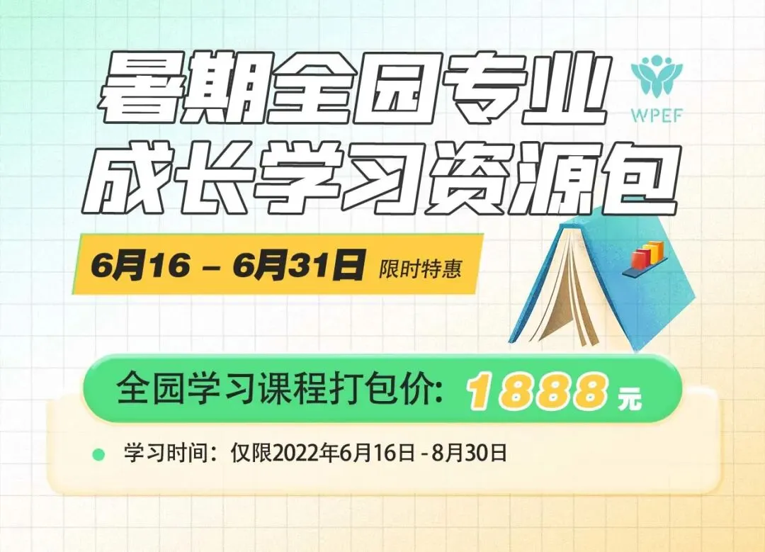 真正有意义的一次学习绝不应成为教育工作者的“负担”,而应当成为一次“赋能”体验。基于此,西部幼教论坛幼师成长学院特别推出【暑期全园专业成长学习资源包】,通过理论与实践结合、学习与互动共存的优质线上课程,让学习没有空间的阻隔,没有时间的限制,实现全园的共同进步、共同成长。
