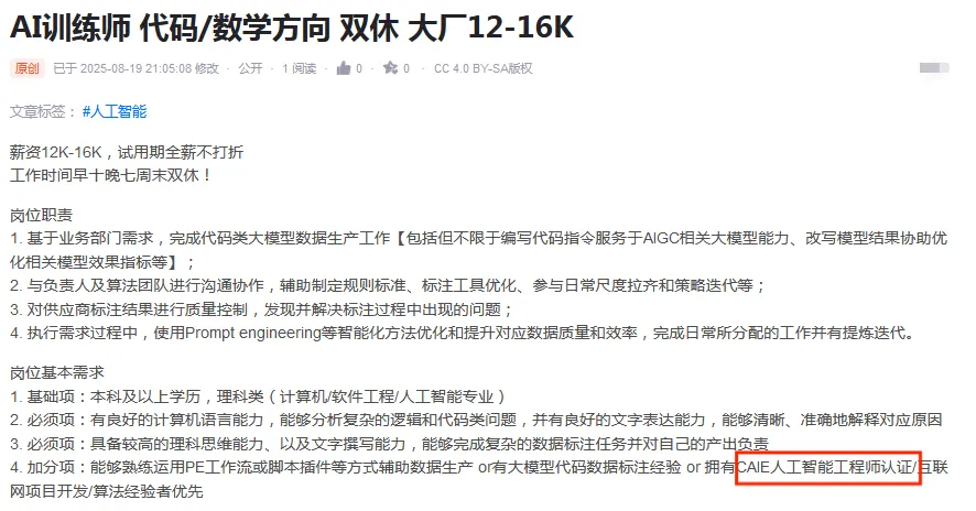 2. 别忽视认证的价值:不是所有证书都有用,但CAIE注册人工智能工程师认证是适配零基础、企业认可度高的“硬通货”,它不仅是能力证明,更是系统化的学习体系,能让你少走80%的弯路;