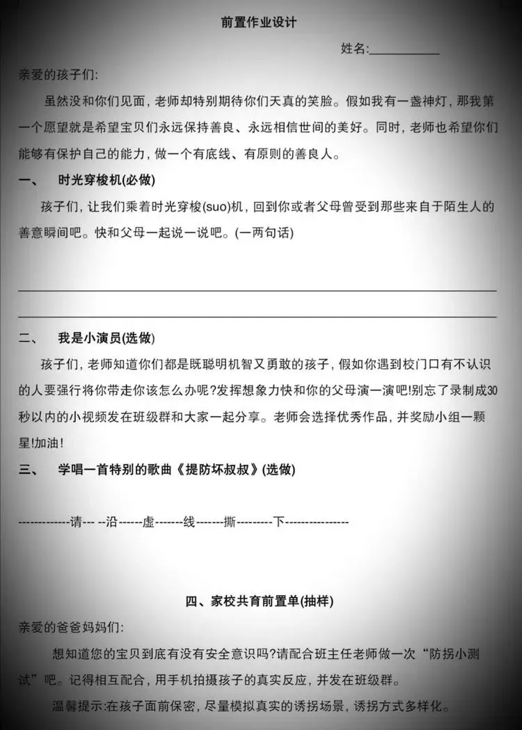 前置作业是基于学生体验的实践性作业,旨在激发学生学习兴趣,增强学生关注生活搜集信息处理信息的内驱动能力。本份前置作业在情境化的导语和前置试题中,实现了学生和文本的对话、文本与生活的对接,学生和生活的接轨。在这样的前置作业驱动下,学生的学习与获得达到了事半功倍的效果,进一步激发学生关注生活、运用课本知识实现自护自卫的能力。