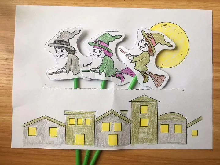 3、剪切后,用透明胶带,将吸管贴在女巫背后,放到剪切出来的空隙里就可以玩了。