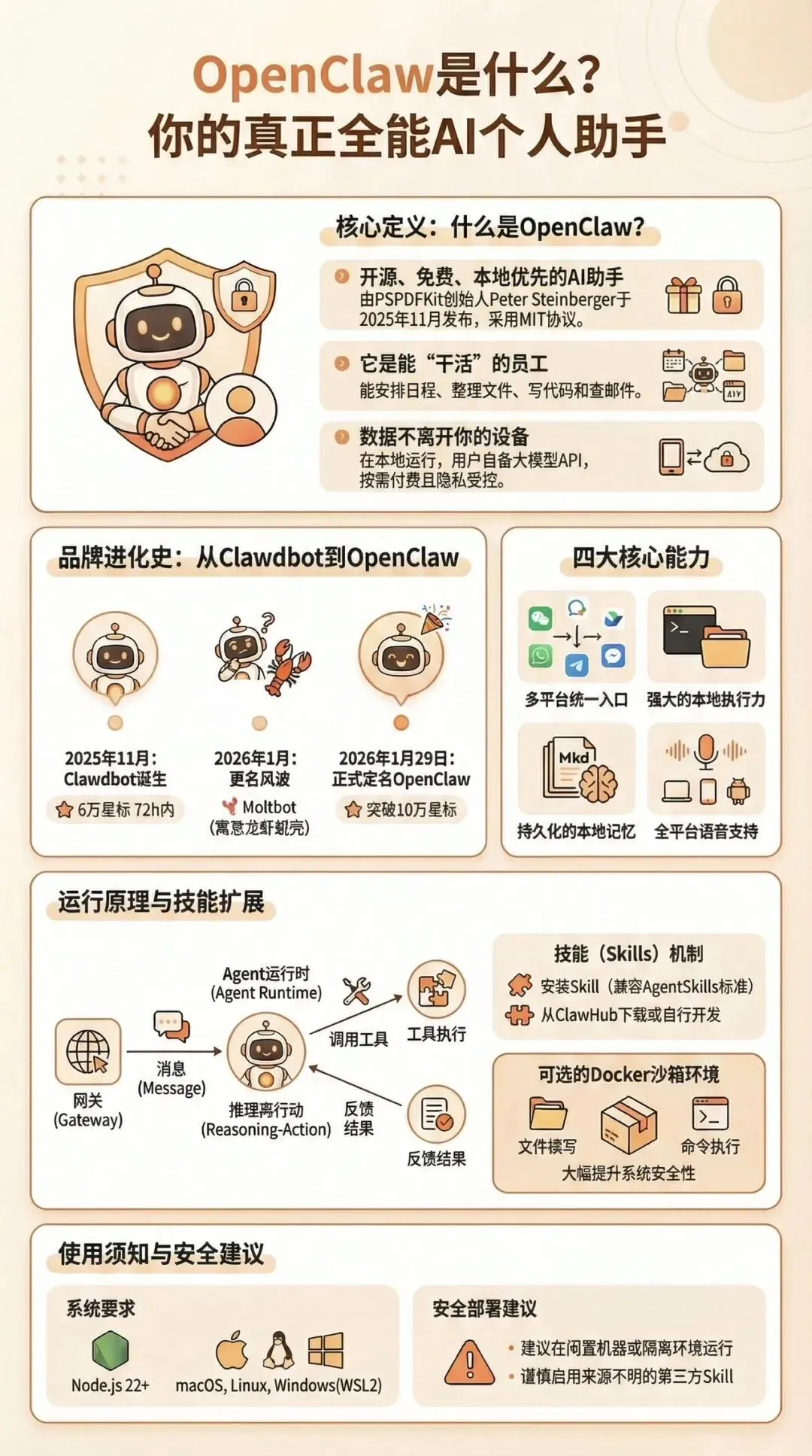 OpenClaw是一款开源的个人AI智能体框架,因为logo是一只红色小龙虾,被大家亲切称为"小龙虾"。它最大的特点就是能动手做事,不像普通AI只会聊天给建议!