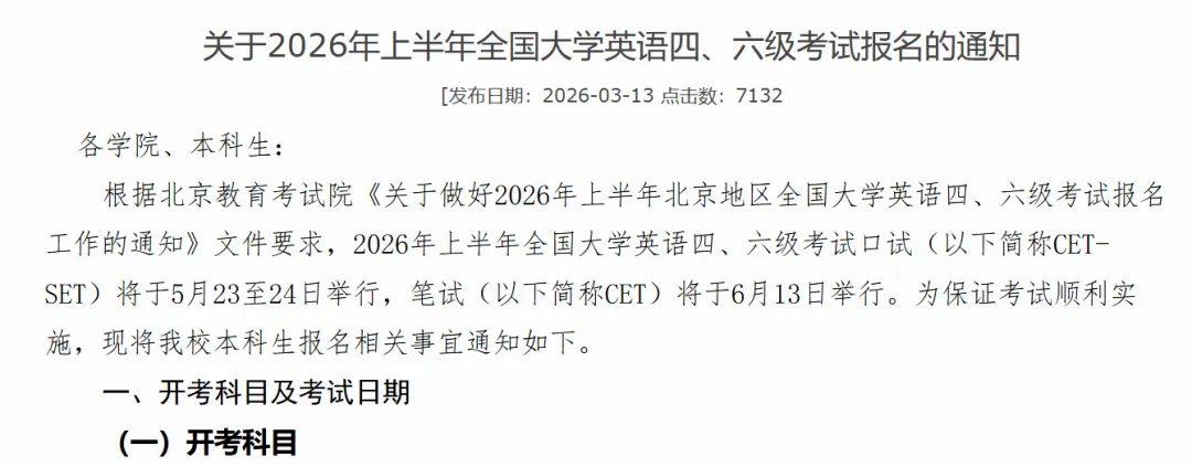 学校发布了《关于2026年上半年全国大学英语四、六级考试报名的通知》报名时间为:2026年3月21日(星期六)10:00-4月2日(星期四)17:00。先报先得,未报上的学生按序候补。各学院、本科生: