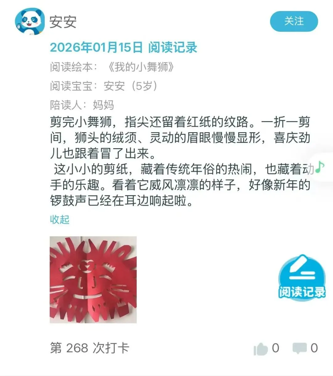 活动中,老师带领小朋友们感受绘本里的版画与剪纸艺术之美,分享《小舞狮》背后的创作故事,并手把手指导大家剪出灵动可爱的小舞狮窗花。让孩子们在动手创作中感受传统年味,在剪纸中触摸非遗文化,收获专属新年的仪式感与创作喜悦!