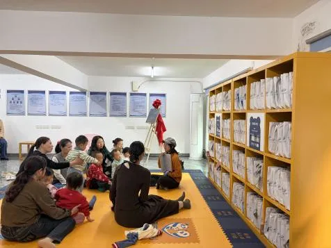 同月,华夏街阅芽图书馆开馆仪式上,志愿者组织故事会活动。活动当天吸引多组亲子家庭前来参加,孩子们围坐听故事,家长们在旁陪同观看。