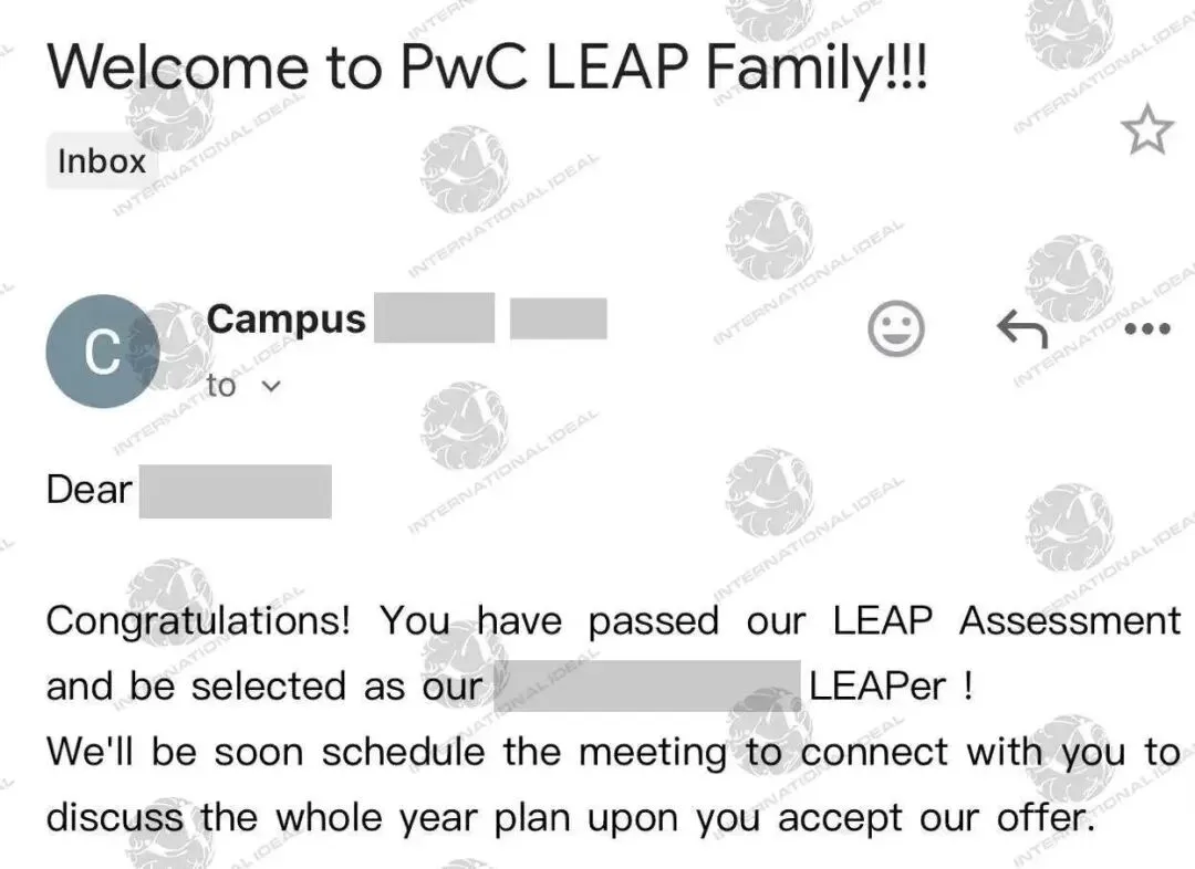 好在是一位执行力很强的学员,找到我们的时候大一下学期,且已经完成了一段实习,有充足的时间进行求职准备。结合Z同学的背景,I.I. 团队分别安排了Risk Management和Investment Banking两个方向的导师为学员普及工作内容以及招聘门槛,通过求职规划辅导P同学对这两个方向有了清晰的认识。之后通过“明日之星”项目包含的远程实习,补充北美实习经历提升背景。学员完善好简历后,学管老师更新低年级项目资讯,也时刻关注着学员的投递进度。同时每月跟进学员的求职计划,帮助学员完成当月安排的求职计划。投递的同时,学员也积极跟导师约课进行networking辅导,课后也不断练习,投递中积累经验,并及时与导师反馈总结经验,求职技巧得到了显著提升。最终学员成功在暑期入选PwC Leaper Program,为后续求职打下坚实基础。Deloitte - Consulting - 暑期实习offer