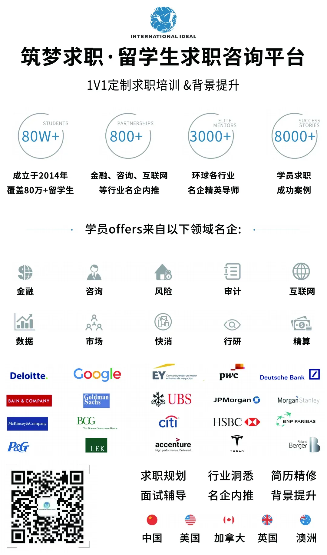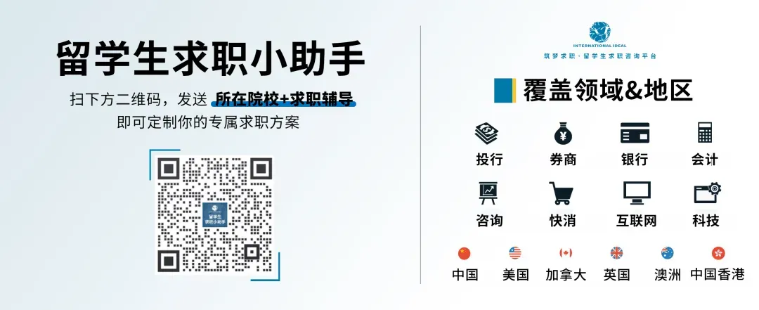 筑梦求职 INTERNATIONAL IDEAL(2014年成立并注册于美国),是北美最早成立的留学生求职咨询平台之一,目前覆盖全球留学生超过80万人。我们荣登“福布斯华人精英TOP100”以及“胡润百富创业领袖”榜单,至今已帮助 8000+ 学员获得来自Goldman Sachs、McKinsey、Deloitte、P&G、Google、Meta等名企的Offers。我们的服务包括:求职辅导、背景提升、名企内推、海外游学等;商务合作请联系:Coop@internationalideal.com