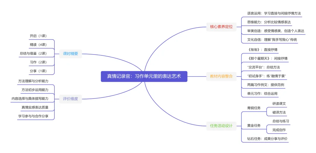 黄金任务:技法修炼,创作真情档案 | 运用“交流平台”总结的方法,通过“初试身手”进行片段练习,借鉴“习作例文”的范例,完成单元习作《让真情自然流露》的构思、撰写、修改与完善。 | 1.“秘籍总结站”:学习“交流平台”,结合青铜任务的鉴赏报告,系统归纳并内化两种情感表达方法。 2.“情境演练场”:进行“初试身手”,选择情境,就心情“好”与“不好”分别写几句话,重点练习“把情感融入景物”的写法,小组内交流互评。 3.“范例参考室”:自主阅读两篇习作例文,关注旁批提示,思考:作者选择了什么事?用了什么方法表达情感?哪一点对我的习作最有启发? 4.“档案创作坊”:完成单元习作。从教材词语唤醒记忆,选择最想记录的情感经历;借鉴例文,思考如何“把内容写具体”“把情感变化写清楚”;运用所学方法进行写作,并依据评价量表自改、互改。 |