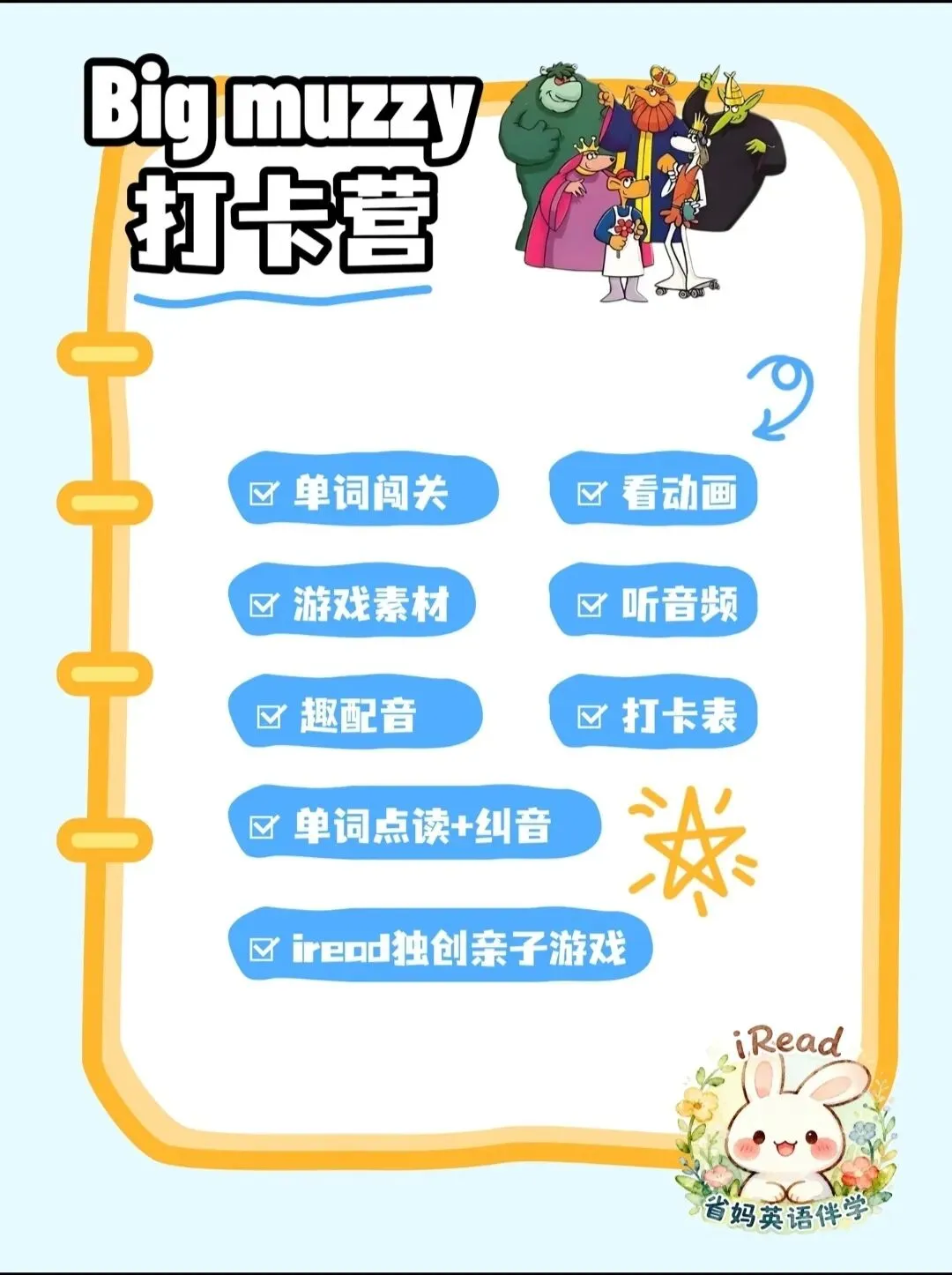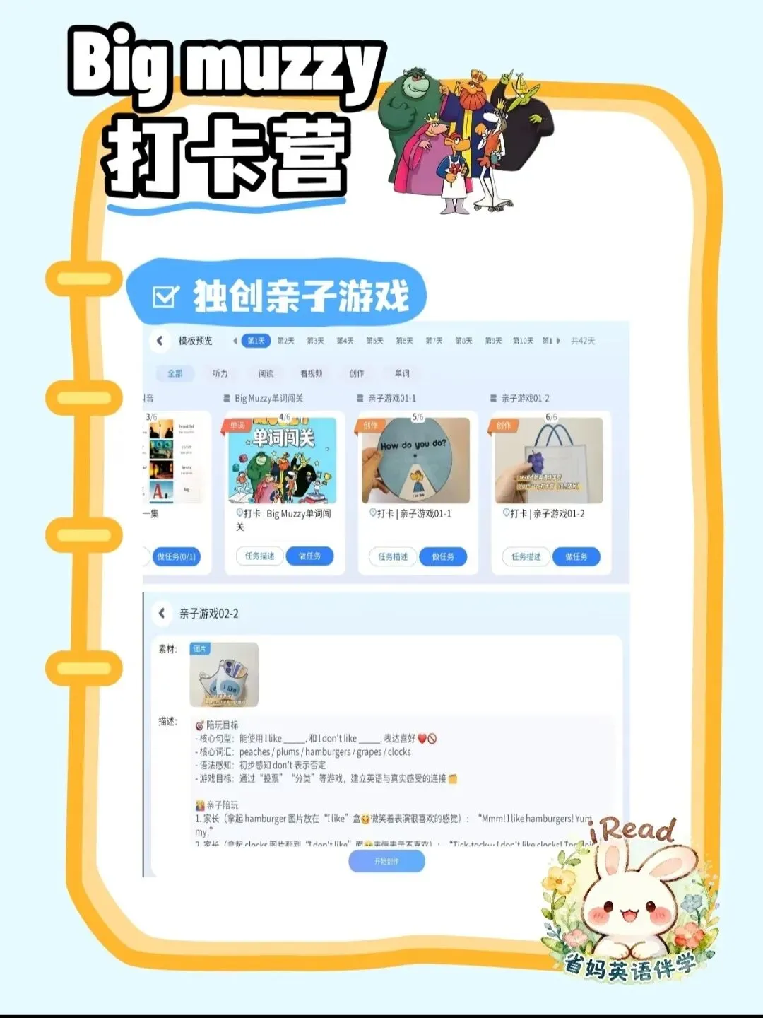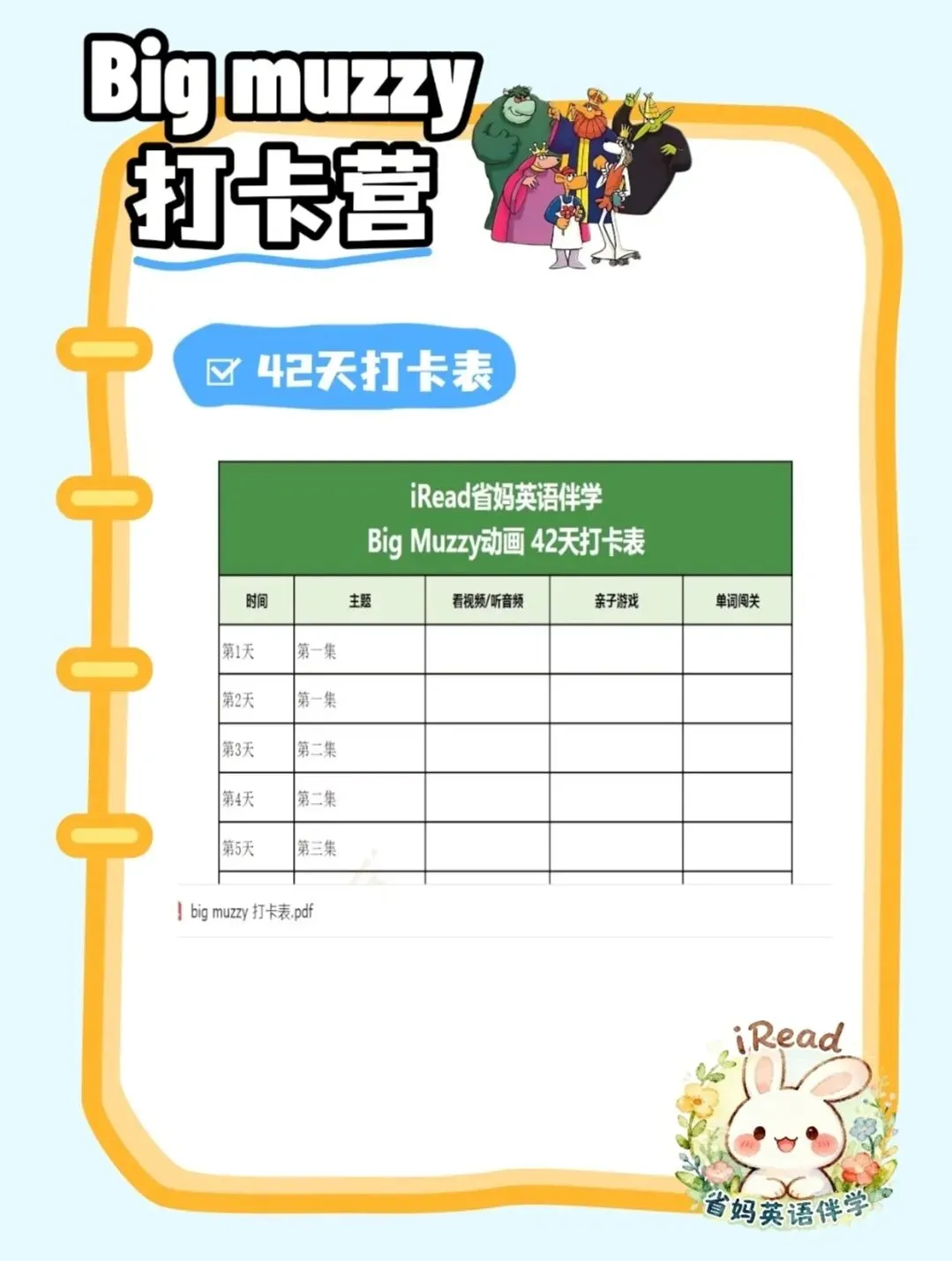 跟着打卡营节奏,用完整资源+清晰计划,帮娃高效吃透Big Muzzy,轻松打好英语基础~