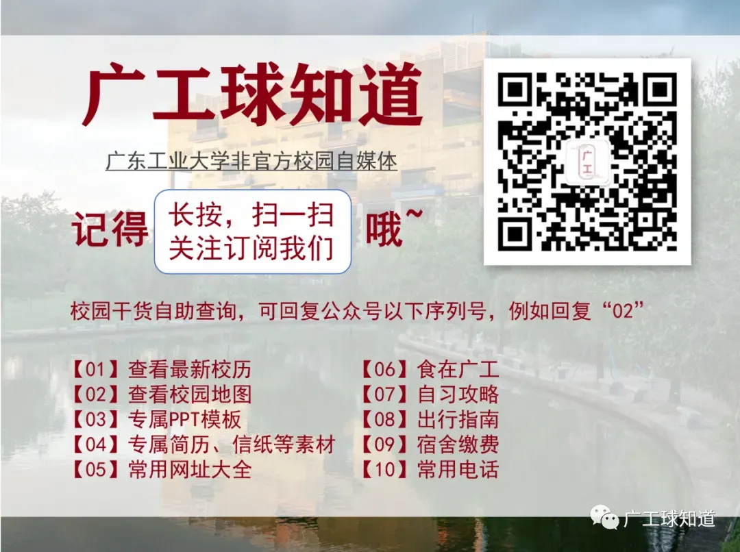 (仅广工同学添加) --关注微信公众号“广工球知道”-- “广东工业大学”PPT模板来了~ 广东工业大学简历模板~ 广东工业大学历年期中期末真题来了~ 事关奖学金就业保研!广工综测加分指南! 广工兼职实习群|每日更新优质岗位 2025亚洲大学排名公布!广工亚洲第几? 广工宿舍大升级!预算达6500万余元!