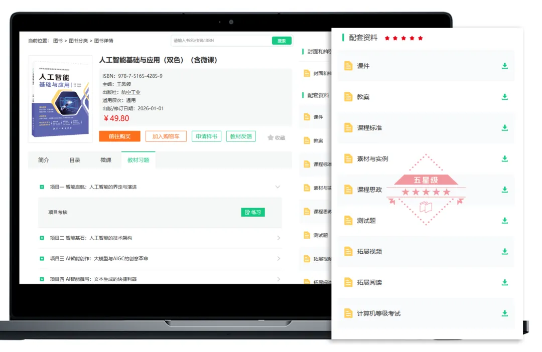 本篇文章为大家推荐与《人工智能基础与应用》教材及相关课程配套的五星级教学资源包。资源包内包含微课、课件、教案、课程标准、素材与实例、课程思政、在线题库、测试题、拓展视频、拓展阅读、计算机等级考试相关资料等丰富、实用的教学资源。