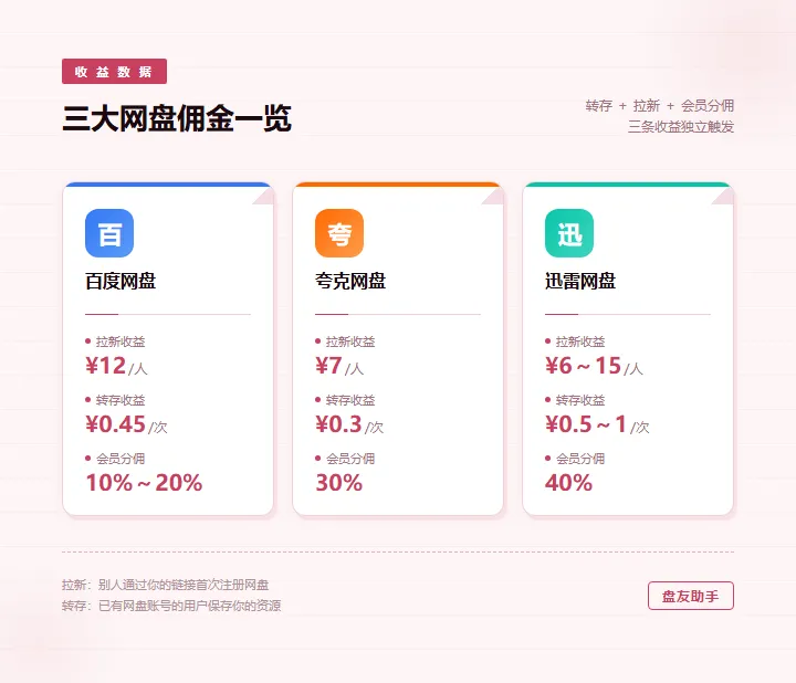 如果你的内容分发到的是公域平台——知乎、B站、贴吧、抖音,很多点进来的人,是第一次注册网盘,或者因为你的链接第一次接触某个网盘,这部分人产生的就不是转存佣金,是「帮平台带来新用户」的收益,百度网盘¥12/人,夸克网盘¥7/人,迅雷网盘¥6~15/人,这两条——转存和拉新——是分开触发的,针对不同用户,不会混在一起,