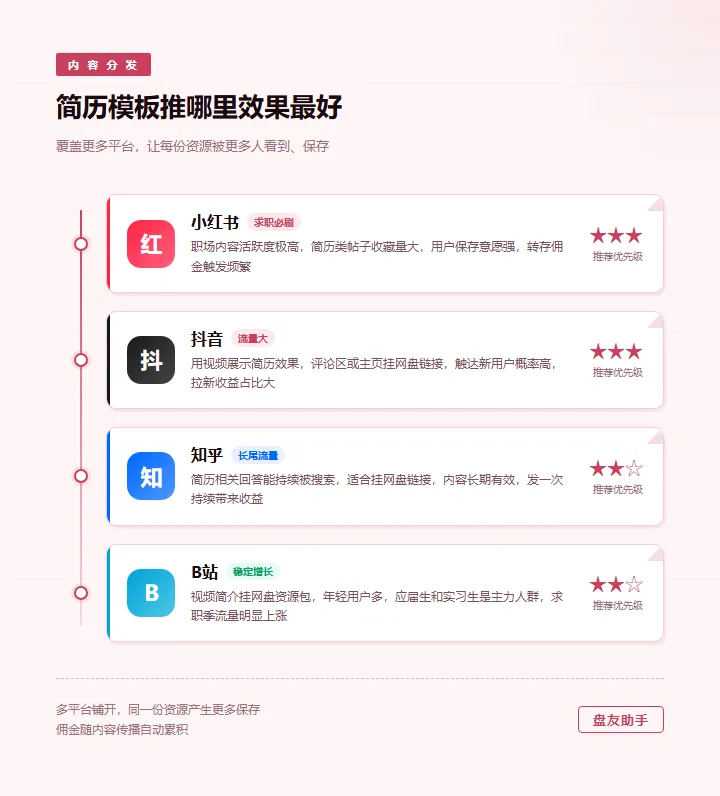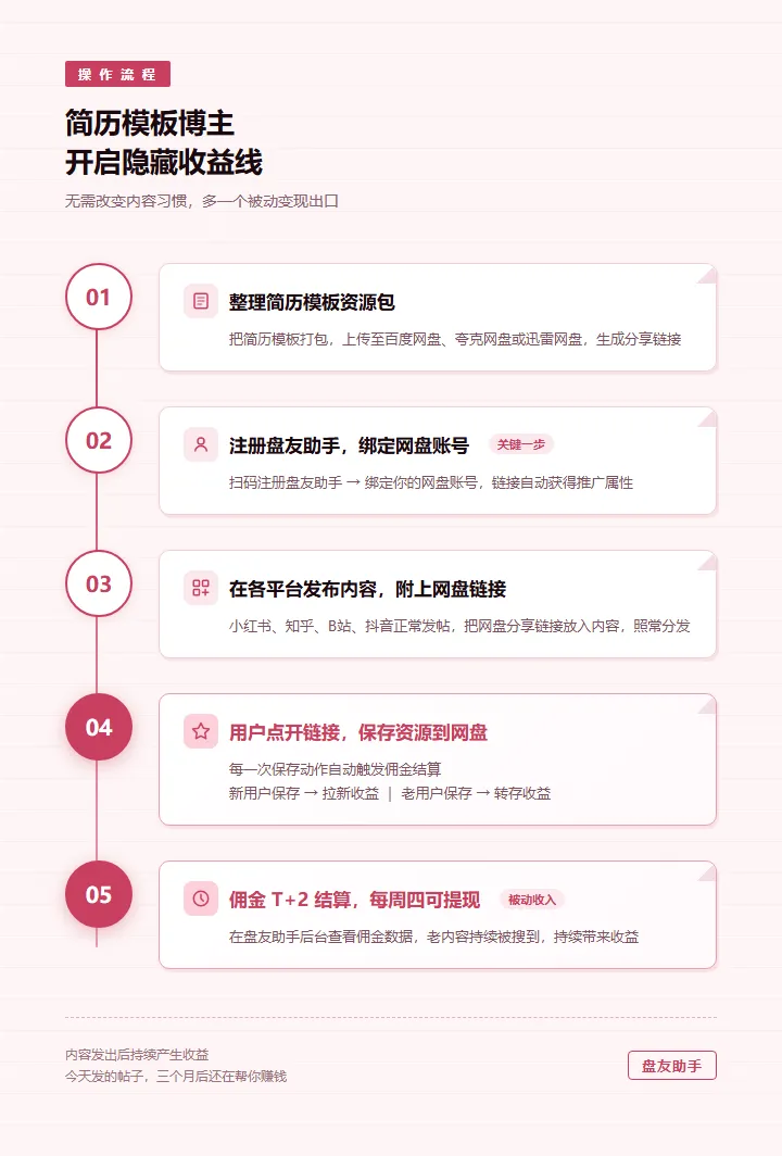 但大多数人只开了一扇门,另一扇更稳的门一直没注意到,这意味着你发出去的每一条内容,后续还会持续被搜索到,你今天发的帖子,三个月后、六个月后,依然有人在点进来,而且这类内容传播方式有个固定动作——把资源包发到网盘,给用户一个链接让他们保存,但大多数人理解的「推广」,是帮平台拉来一个全新注册的用户,觉得和自己没什么关系,你把简历模板发到网盘,关注者点进来保存到自己的网盘——每发生一次这个动作,都可以产生一笔小额佣金,百度网盘¥0.45/次,夸克网盘¥0.3/次,迅雷网盘¥0.5~1/次,但你想想,一条小红书或知乎的简历模板帖子,保存的人少说也有几十到几百,这些保存动作,在没有任何额外操作的情况下,本来就在发生,三、 只有几条路能让收益10倍,这是其中最稳的一条