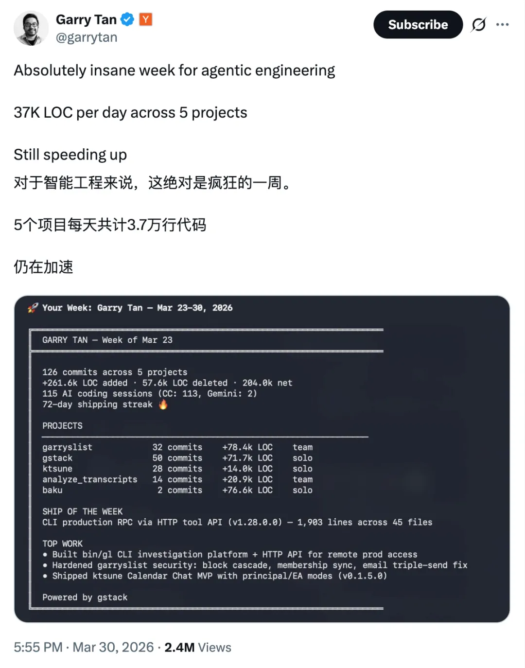 Tan 在 X 上表示,自己和 AI coding agents 正在同时推进 5 个项目,平均每天部署 3.7 万行代码,并称这是「agentic engineering 疯狂的一周」,还补充自己已经连续 72 天保持发布节奏。