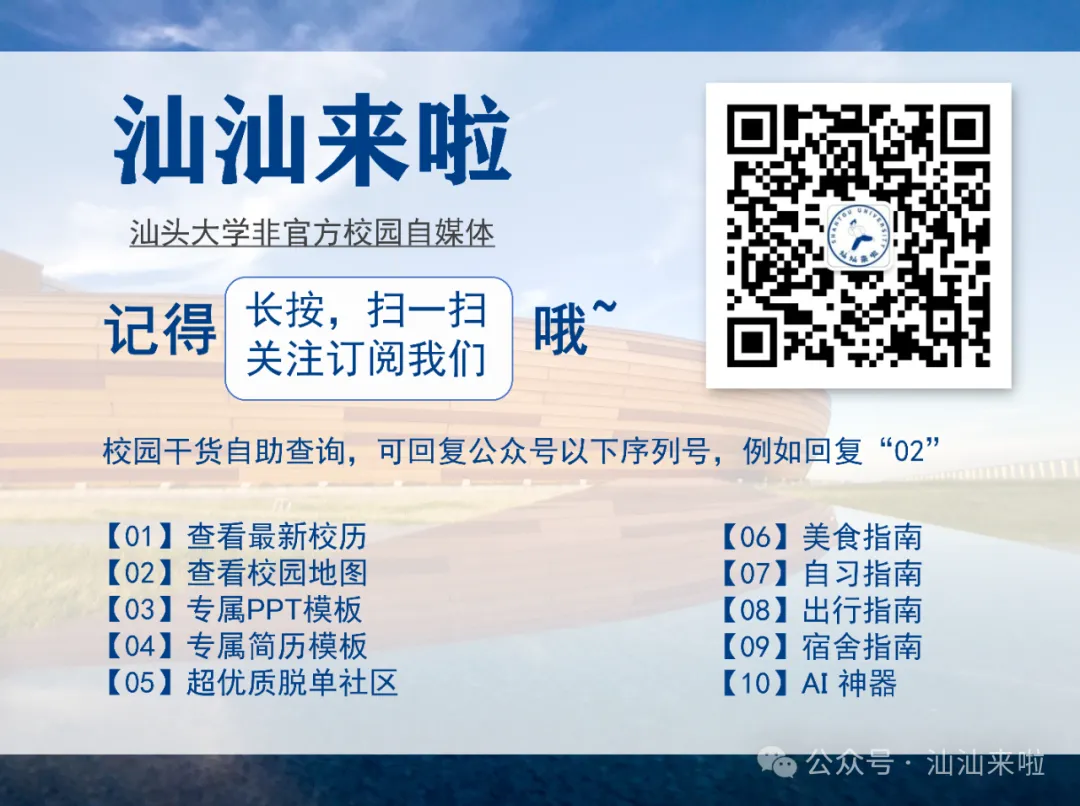 --关注微信公众号“汕汕来啦”-- 汕头大学简历模板~ “汕头大学”PPT模板来了~ 广东高校2025年经费预算出炉,汕大多少? 祝贺!汕大有6个学科上榜! 汕大二手交易群来啦! 汕大这几个食堂更换承包商啦! 汕大线上实习兼职群来啦!