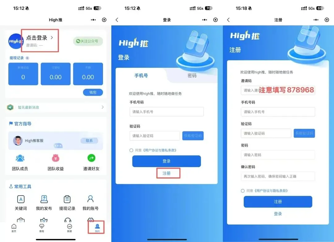 1.注册平台:打开high推小程序我的high推注册邀请码为:878968