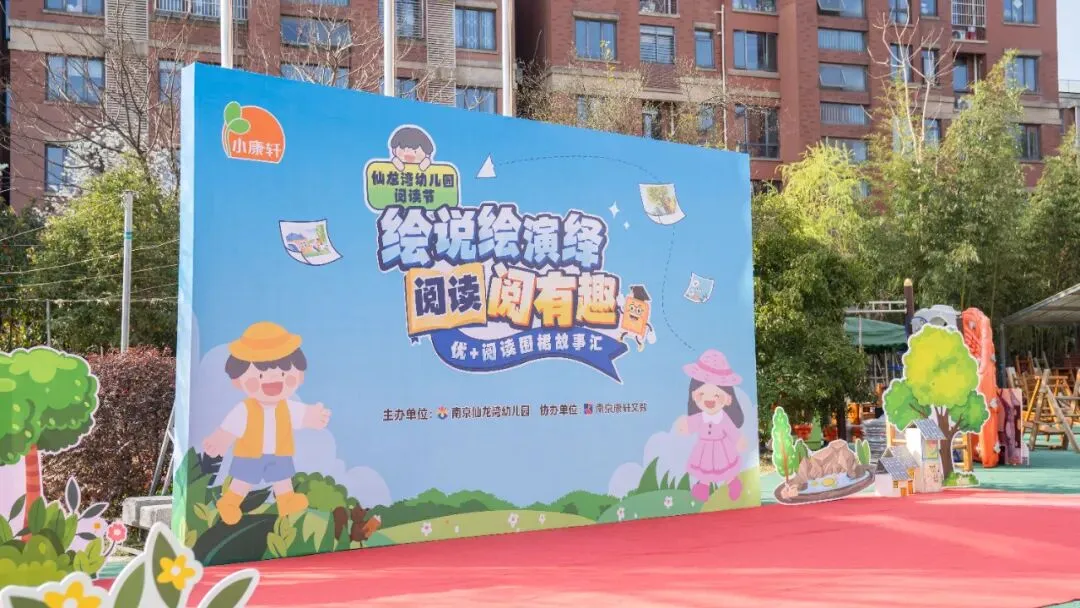 搭建主题舞台,悬挂“书香润童心,阅读伴成长”大型横幅,用气球、彩带、绘本造型展板等装饰营造温馨且富有童趣的氛围。