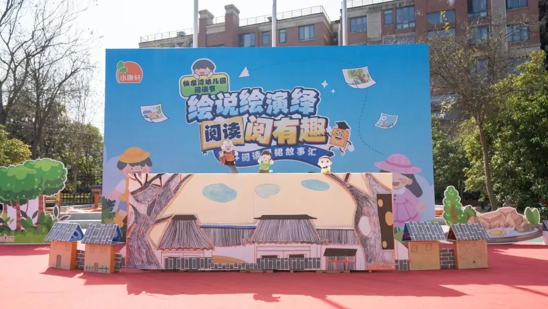 舞台两侧设置成果展示区,精心摆放幼儿自制绘本、阅读小报、亲子阅读记录册、教师阅读心得集等作品,并用标签标注作品名称、作者及创作理念。