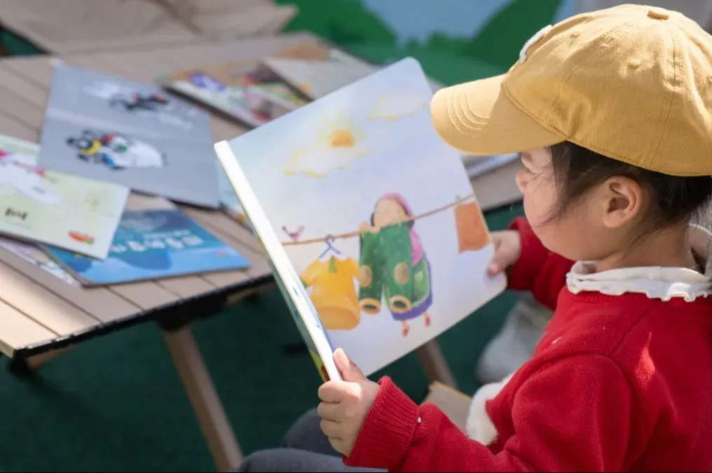 在幼儿园操场上设置打卡活动,如图书行李箱集市、悦喜阅读、跳蚤市场、阅享童年、赴一场春天的“阅”会。