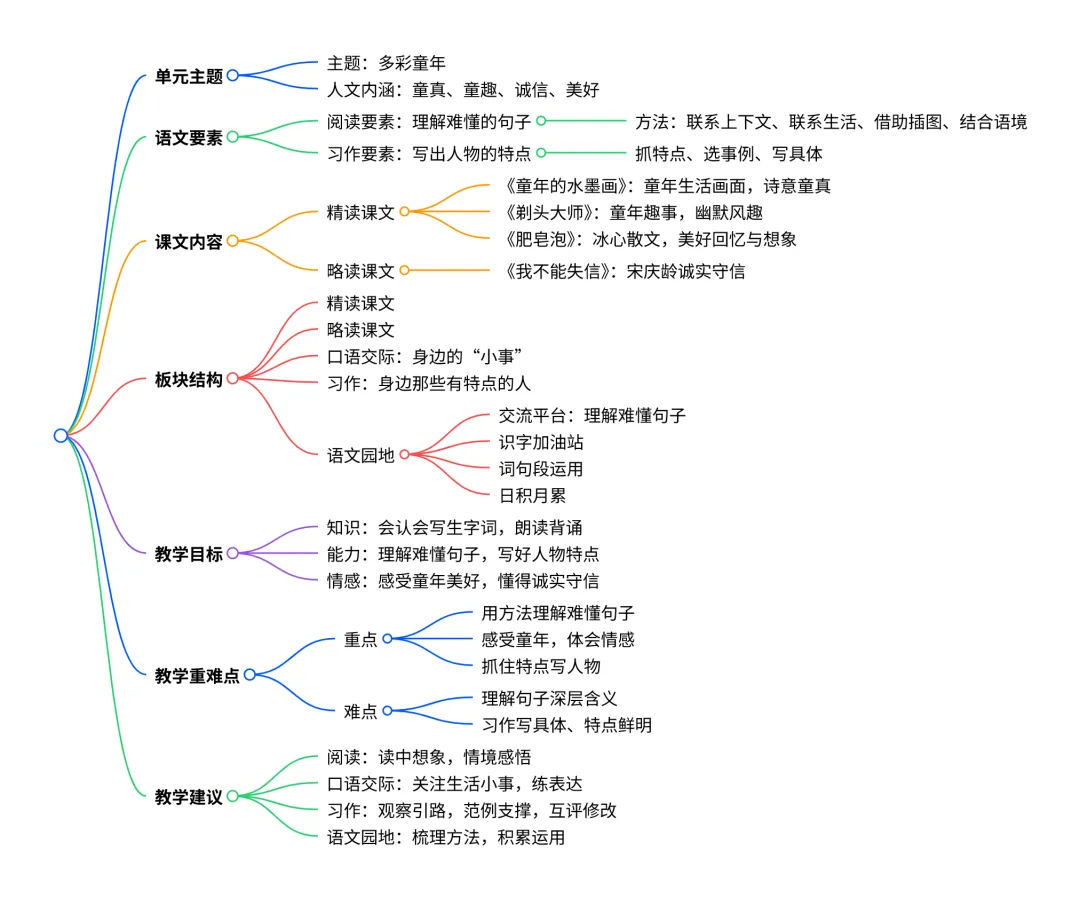 1. 单元整体统整,构建梯度化学习路径:以单元为整体,梳理文本梯度与主题线索(如三年级下册第六单元以 “童年趣事、美事、糗事、真事” 为线索),将阅读、习作、口语交际等板块贯通,实现 “从理解到运用” 的能力进阶;如《童年的水墨画》《肥皂泡》等课例,以主题串联,兼顾文本美感与能力培养。