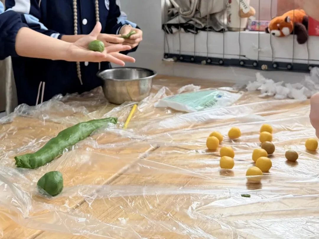 接下来就是根据这个步骤制作青团啦,我购买的是免蒸免煮的青团预拌粉和配套的馅料,把学生分成几个组每个组发一包粉一包馅,给一个盆烧一壶热水再发一点保鲜膜他们就可以开始行动啦~
